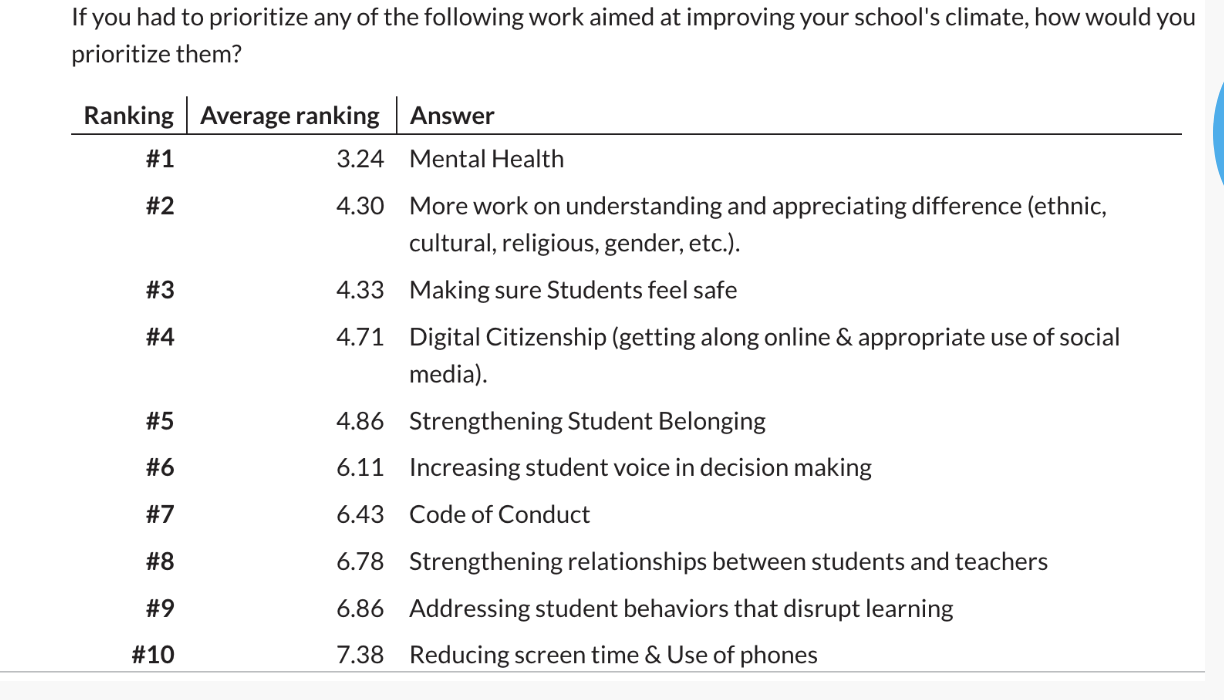 The TOP THREE priorities for our students were 1) Mental Health, 2) More work on understanding and appreciating differences (ethnic, cultural, religious, gender, etc.), and 3) Making sure students feel safe.